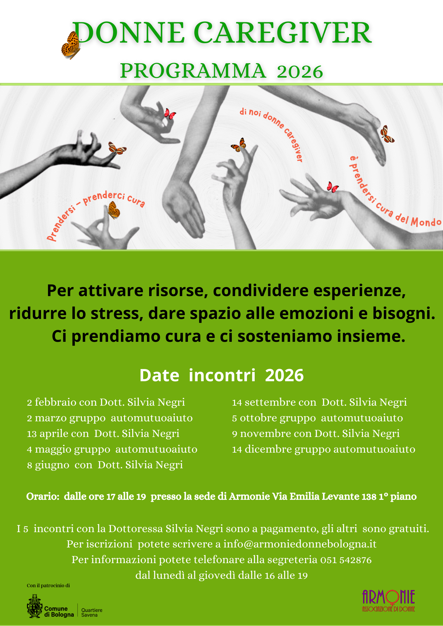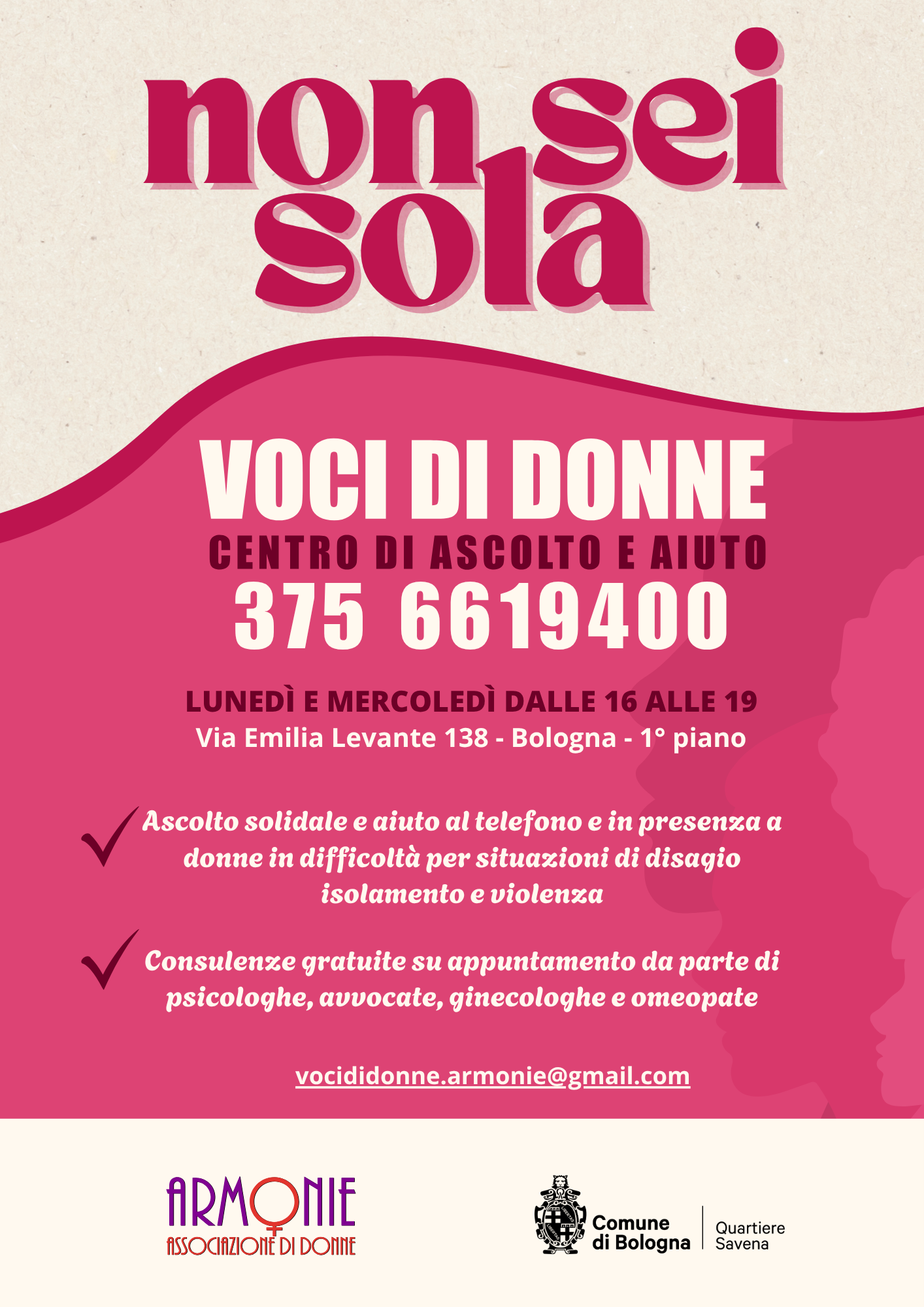 Voci di Donneè un centro di ascolto, orientamento e accoglienza telefonica gestito dalle volontarie di Armonie e rivolto alle donne. Chiama il 375 6619400 il lunedì e mercoledì dalle 16 alle 19. Nuovo indirizzo mail di Voci di Donne: vocididonne.armonie@gmail.com |