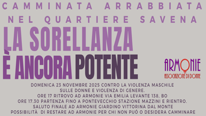 DOMENICA 23 NOVEMBRE 2025 CAMMINATA ARRABBIATA NEL QUARTIERE SAVENA CONTRO LA VIOLENZA MASCHILE SULLE DONNE E VIOLENZA DI GENERE ORE 17 RITROVO AD ARMONIE VIA EMILIA LEVANTE 138, BOLOGNA ORE 17.30 PARTENZA FINO A PONTEVECCHIO STAZIONE MAZZINI E RIENTRO SALUTO FINALE AD ARMONIE GIARDINO VITTORINA DAL MONTE POSSIBILITÀ DI RESTARE AD ARMONIE PER CHI NON PUÓ O DESIDERA CAMMINARE 25 NOVEMBRE 2025 Giornata contro la violenza maschile sulle donne e violenza di genere Non faremo nuovamente l’elenco di tutte le forme di violenza che subiamo in quanto donne in questa società: dalle molestie ai soprusi quotidiani alle tante forme di...