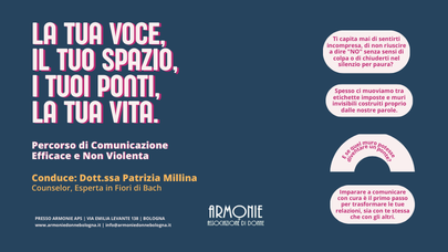 LA TUA VOCE, IL TUO SPAZIO, I TUOI PONTI, LA TUA VITA. Percorso di Comunicazione Efficace e Non Violenta Conduce: Dott.ssa Patrizia Millina, Counselor, Esperta in Fiori di Bach IL PROGRAMMA 12 Marzo 2026 | Ascolto Attivo Esserci e comprendere davvero 26 Marzo 2026 | Le Domande Esplorare e trovare le proprie soluzioni 09 Aprile 2026 | La CNV I 4 passi del metodo Rosenberg 23 Aprile 2026 | Laboratorio Mettiamoci alla prova con esercitazioni pratiche.