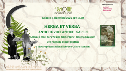 HERBA ET VERBA ANTICHE VOCI ANTICHI SAPERI Letture e canti da “L’Argine delle erbarie” di Silvia Cavalieri. Con Annalita Bellei e l’autrice sabato 7 dicembre alle 17.30 Le vicende delle erbarie, delle mondine e delle partigiane nella Bassa pianura emiliana diventano camera di risonanza per cantare altre donne, lontane nella geografia ma vicine nel sentire. Una spirale di donne sul filo di due voci. Seguirà un incontro con l’autrice del romanzo L’argine delle erbarie in dialogo con Chiara Stanzani Prenotazione obbligatoria biblioteca.armonie@gmail.com