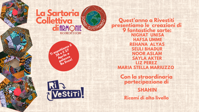 Vi aspettiamo a Palazzo Re Enzo l’1 e il 2 aprile dalle 11,00 alle 13,00 e dalle 15,00 alle 18,00 con il work-shop di ricamo e uno stand per Terra Equa – Rivestiti fiera della moda ecosostenibile Armonie associazione di donne partecipa a Terra Equa: Rivestiti con il progetto “Donne Cucimondo” Sartoria collettiva incentrato quest’anno sul ricamo e sulla creatività di Shahin, donna bangladese, laureata in Economia, appassionata dell’arte del ricamo, appresa dalla nonna. I suoi manufatti sono eseguiti conmaestria e originalità.Nello stand troverete oltre a oggetti ricamati a mano come borse, spille e portachiavi, tovaglioli eco-sostenibili:– in tessuto di...