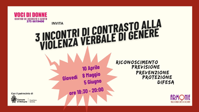 INCONTRI DI CONTRATO ALLA VIOLENZA VERBALE DI GENERE Quante forme di violenza ci sono? Tante, troppe ed una delle più frequenti e più subdola è sicuramente la violenza verbale di genere, come imparare a riconoscela, come imparare a difenderci? In dialogo con la psicoterapeuta Roberta Amato, la psicologa Sonia Yamile Canè e le volontarie di Voci di Donne 3 incontri a tema 10 aprile, 8 maggio e 5 giugno 2025 Per info: vocididonne.armonie@gmal.com