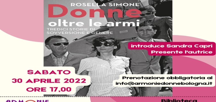 Biblioteca Sandra Schiassi Sabato 30 aprile 2022 ore 17,00Donne oltre le armi di Rosella SimoniIntroduce Sandra Capri Presente l’autrice Prenotazione obbligatoria info@armoniedonnebologna.itUn libro intenso che, nell’interrogare e interrogarsi sulle vite di tredici donne che negli anni ’70 hanno partecipato al grande sogno di un cambiamento sociale, ricostruisce un’epoca che ha accumunato paesi al di qua e al di là dell’oceano. Su tutto questo aleggia il presente, nominato poco ma doloroso come una spina nel fianco, e insieme, immancabile, la nuvola nera del futuro da dissipare senza l’aiuto della giovinezza. “Avevo voglia di parlare delle donne della mia generazione. Donne nate...