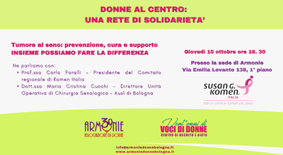 Giovedì 10 ottobre ore 18.30 DONNE AL CENTRO: UNA RETE DI SOLIDARIETA’ Tumore al seno: prevenzione cura e supporto INSIEME POSSIAMO FARE LA DIFFERENZA L’incontro si terrà in presenza e online chi è interessata/o può richiedere il link dell’incontro a info@armoniedonnebologna.it