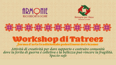 Domenica 18 maggio dalle 16 Workshop di Tatreez In collaborazione con Bologna per Gaza, ci troviamo le domeniche pomeriggio a ricamare il Tatreez, una forma d’arte tradizionale palestinese di ricamo. Attività di creatività per dare supporto e costruire comunità dove la ferita di guerra è collettiva e la bellezza può vincere la fragilità. per prenotazioni volontatipergaza@gmail.com