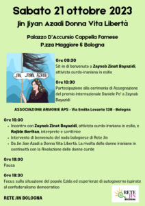 Invitiamo a partecipare all’ incontro che si terrà a Bologna in occasione del Premio Internazionale Daniele Pò, quest’anno assegnato all’attivista curdo iraniana Zayneb Zinat Bayazidi, il cui nominativo è stato segnalato da Delsha Osman di Kongra Star.