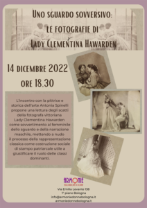 L’incontro con la pittrice e storica dell’arte Antonia Spinelli propone una lettura degli scatti della fotografa vittoriana Lady Clementina Hawarden come sovvertimento al femminile dello sguardo e della narrazione maschile, mettendo a nudo il processo della rappresentazione classica come costruzione sociale di stampo patriarcale utile a giustificare il ruolo delle classi dominanti.