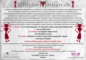Le Officine Matriarcali sono laboratori in cui s’impara a ricontestualizzare nel presente il paradigma matriarcale. Attraverso l’esplorazione di narrazioni alternative del passato storico e preistorico, di mitologie altre e d’insegnamenti offerti da società indigene tuttora matriarcali, impareremo a conoscere le visioni sociali, politiche, spirituali ed eco-logiche di questa specifica formazione sociale, volutamente occultata dal patriarcato.