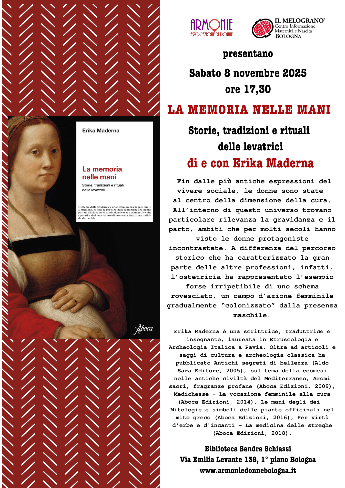 Sabato 8 novembre 2025 ore 17.30 Presentazione del libro: LA MEMORIA NELLE MANI” Storie, tradizioni e rituali delle levatrici di e con Erika Maderna