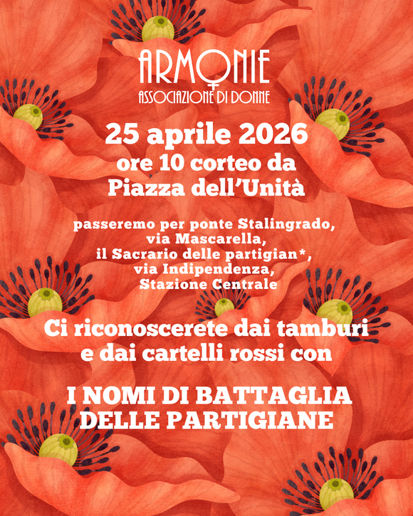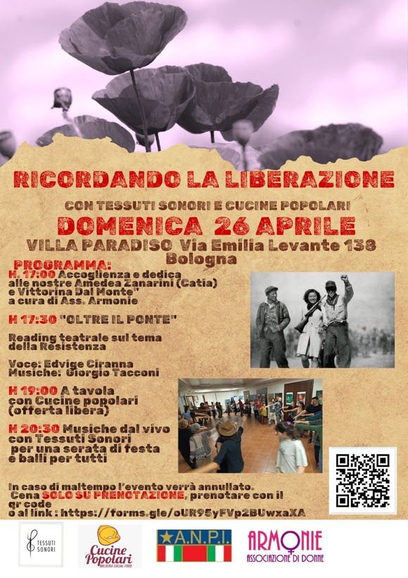 Il 26 aprile partecipiamo all’iniziativa delle Cucine Popolari con una dedica speciale alle nostre partigiane Amedea Zanarini (Catia) e Vittorina Dal Monte. E ricordiamo anche le altre partigiane bolognesi attraverso una esposizione di opere a loro dedicate e un’ installazione a Renata Viganò, di cui ricorrono i 50 anni dalla morte. Per prenotare la cena cliccate qs link forms.gle/oS7cfDPMsZ7A2k787 e se volete aggiungete al vostro nome Armonie per stare insieme. Vi aspettiamo!